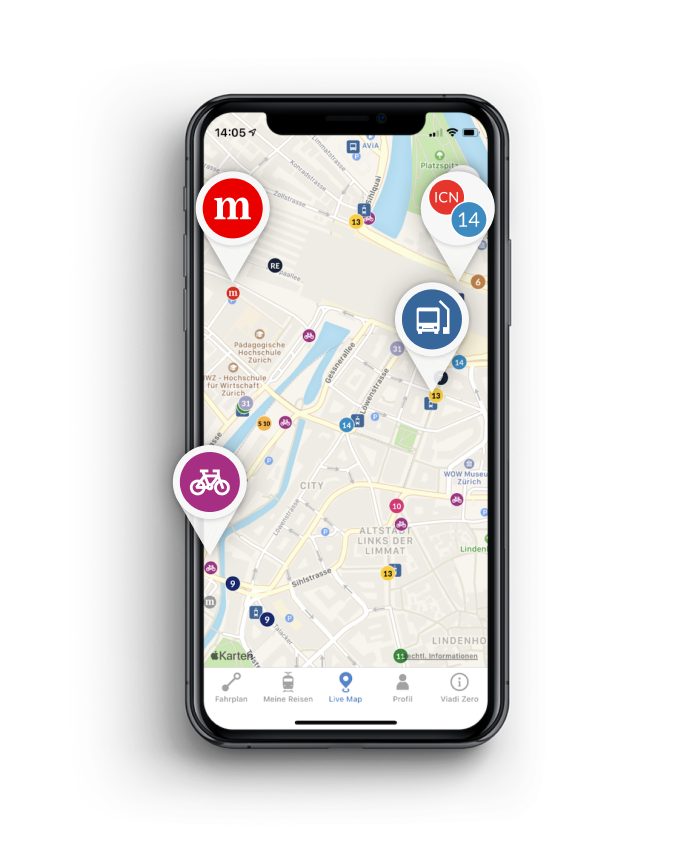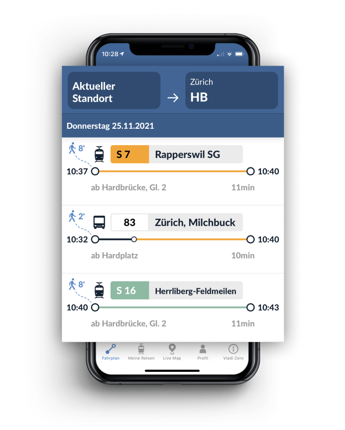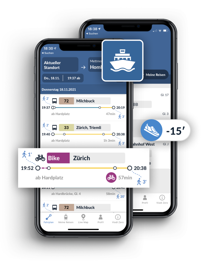 Knapper Anschluss: Mit den Turnschuh-Verbindungen kommst du fix von A nach B.Mehr als ÖV: Neben dem ÖV nutzt du auch gerne mal PubliBike oder Mobility? Viadi Zero weiss, wann sich das zeitlich lohnt.